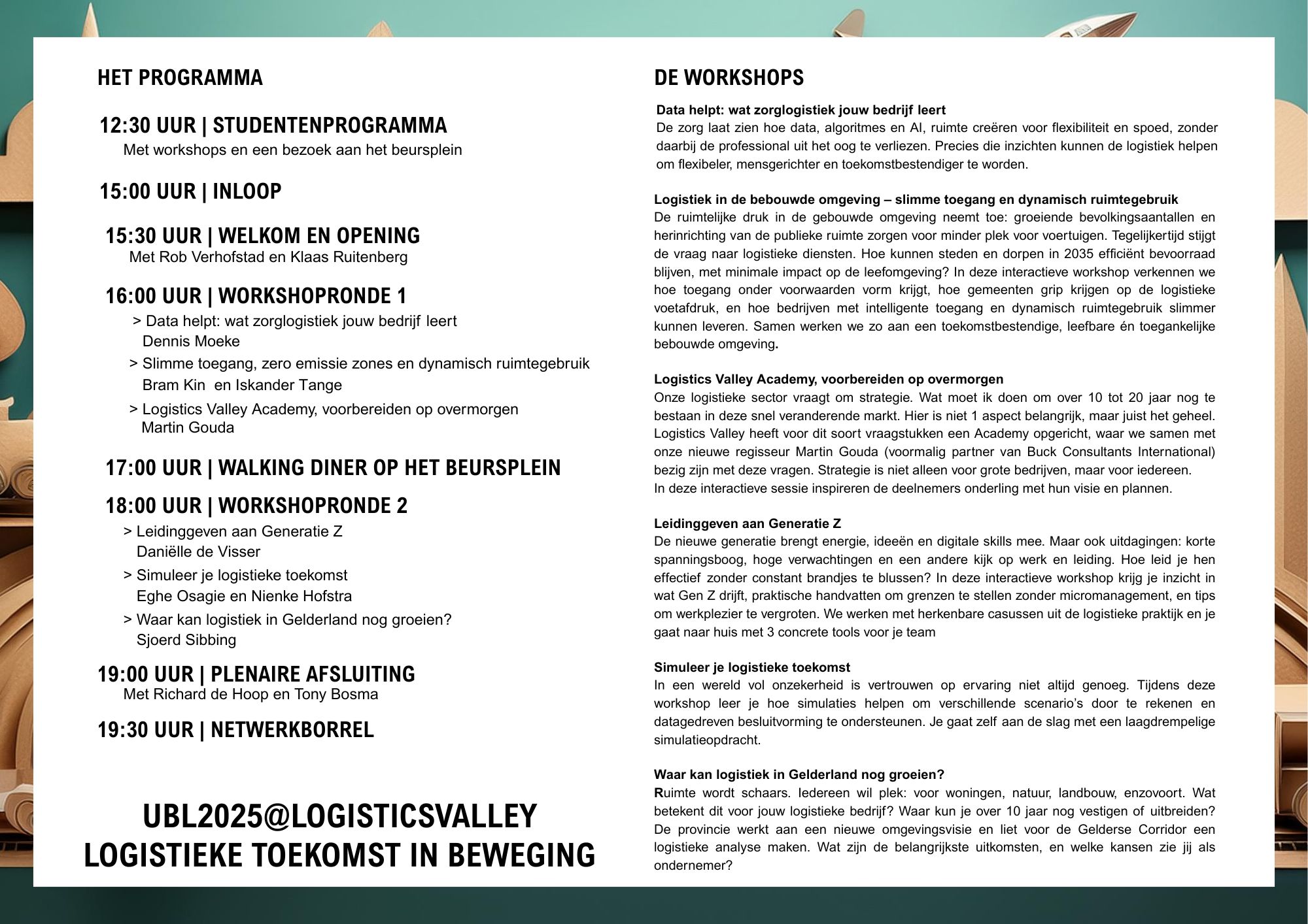 Met interactieve workshops over o.a. kansen met data, verrassende tools, en een deep dive in de stadslogistiek onderzoeken we samen met welke logistieke innovaties we vandaag nog moeten starten voor de vitale samenleving van morgen.