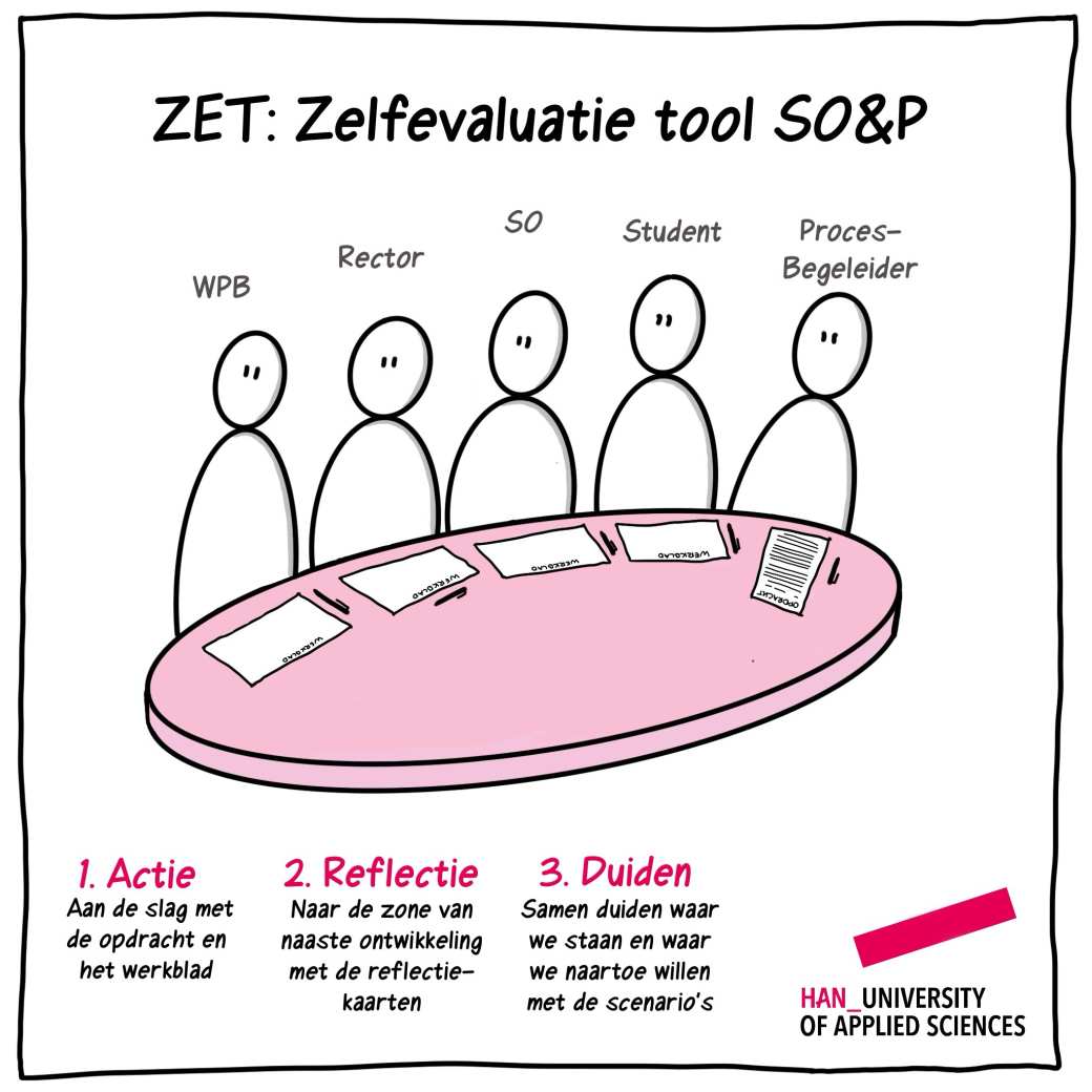 Onder begeleiding van een externe procesbegeleider gaan de deelnemers in multidisciplinaire groepen aan de slag met het activerende materiaal van de ZET waarbij ze aan de hand van gerichte individuele en groepsgewijze opdrachten in twee rondes in gesprek gaan over verschillende van bovenstaande thema’s. Dit alles resulteert in een rijke opbrengst met betrekking tot de stand van zaken van de opleidingsschool en het Samen opleiden en professionaliseren op de bewuste schoollocatie. Deze opbrengst wordt door de betrokken schoolopleider verwerkt in een verslag dat vervolgens in het opleidingsteam van de school wordt besproken en dat richting kan geven aan het jaarplan.