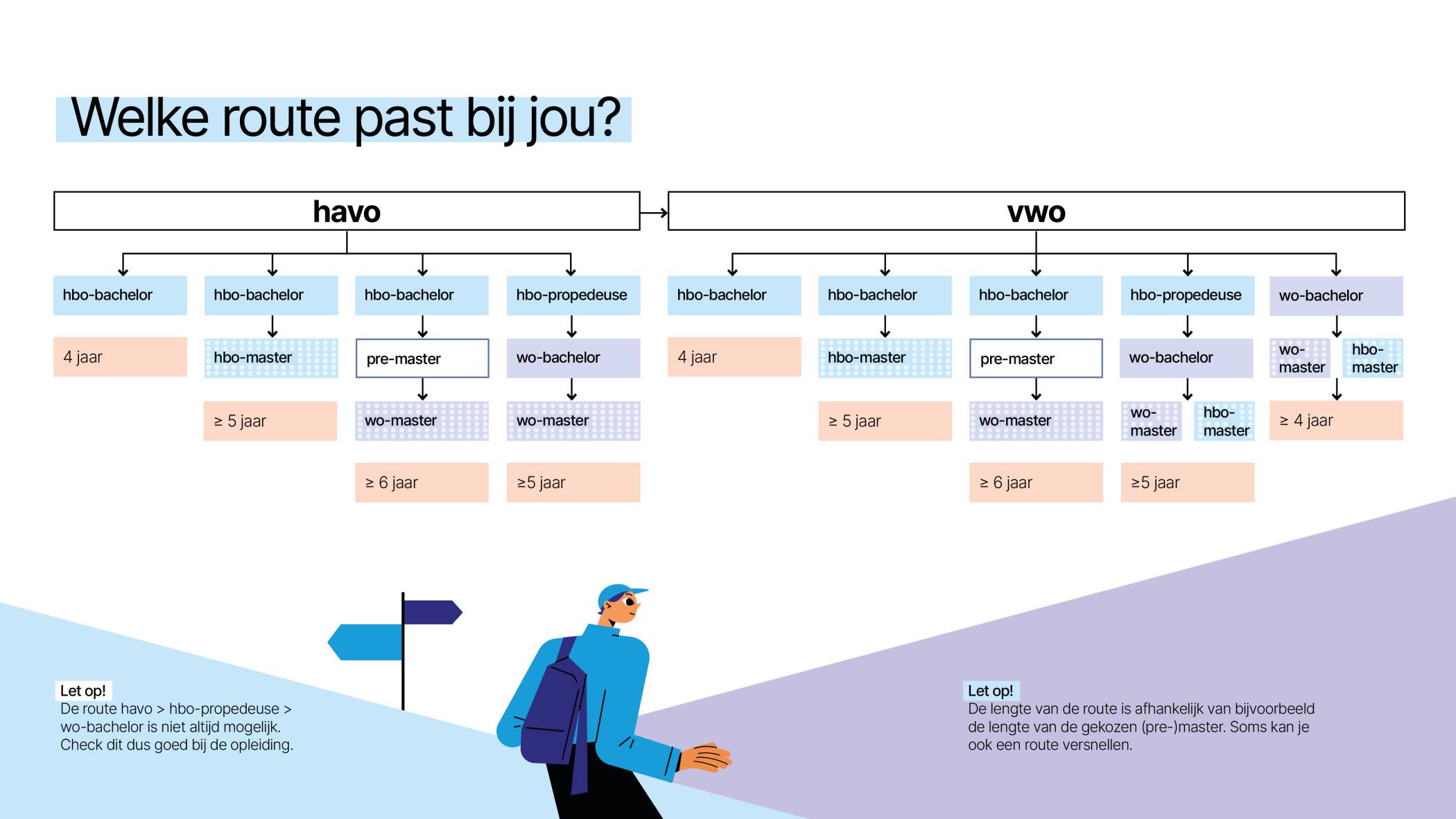 Als je start met een opleiding in het hoger onderwijs kan je daarna heel veel kanten op. Welke route jij neemt hoef je niet meteen te bepalen, dat kan ook tijdens je studie nog veranderen. Kijk wat er allemaal mogelijk is en welke routes jij met jouw diploma kunt afleggen.